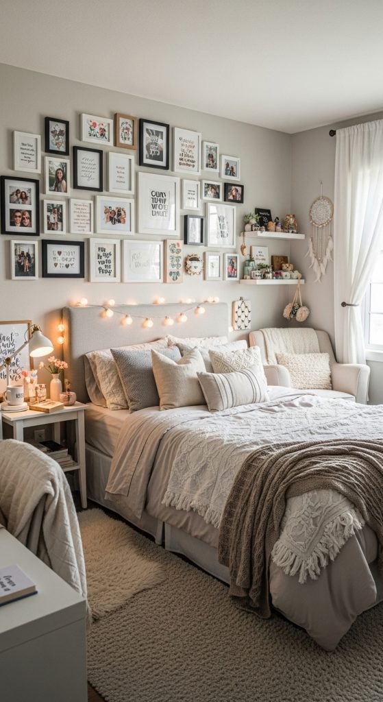 - Decor: A mix of framed prints, posters, and photos arranged on one large wall.