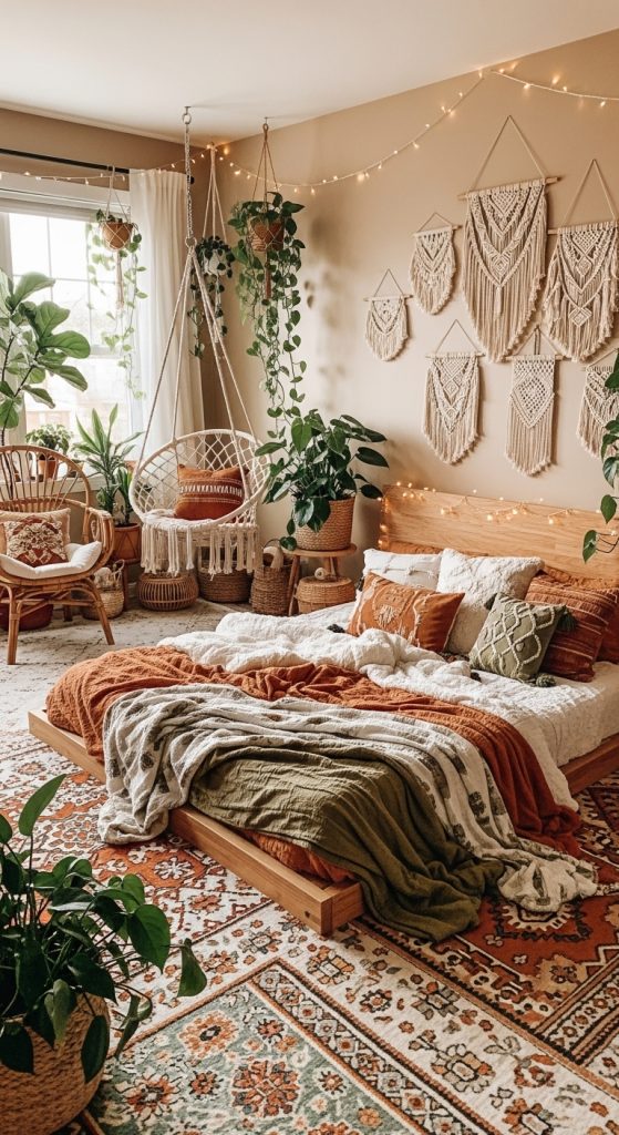 - Decor: Plants, fairy lights, dreamcatchers, and eclectic artwork create the perfect boho vibe.