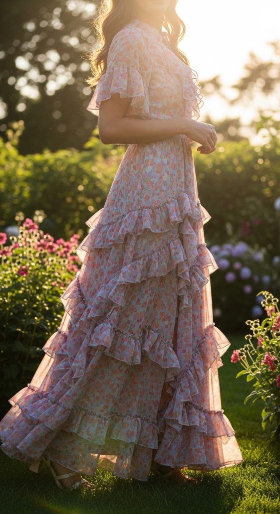 If you prefer a more flowy and dramatic style, a ruffled maxi dress is perfect for you. The cascading ruffles add volume and movement, creating a soft and feminine aesthetic. Opt for bright colors or floral prints for daytime parties and pastel tones for evening gatherings. Pair it with wedges or block heels for comfort. Keep the accessories delicate and let the dress speak for itself. This look works especially well for outdoor or garden parties, where the relaxed silhouette adds to the charm of the occasion.